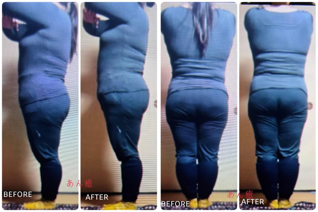 全身の浮腫みを流していただいて、骨格も整えていただいて、まず終了してからの自分の顔色にびっくりしました。え?なんか顔色いい?なんか顔が違う?と感じ、ビフォーアフターの比較で顎がスッキリ、肩のモリッとした部分がなくなり首が長くなってる、背中の贅肉の食い込みも薄くなってる!もう挙げたらキリがありませんでした。